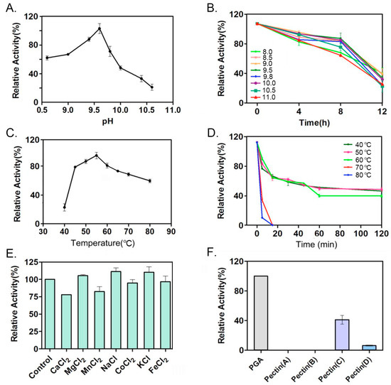 Enzymatic characterization demonstrated that PelA can effectively digest polygalacturonic acid into mono-, di-, and tri-saccharides. As previously reported [21], pectate lyase can break polygalacturonic acid through a trans-elimination mechanism, resulting in C4:C5-unsaturated products that exhibit an absorbance peak within the 230–270 nm wavelength range. As illustrated in Figure 3, the digested products of PGA display a strong ultraviolet absorption peak at 240–270 nm, which corroborates the aforementioned speculation and indicates that the enzyme PelA from P. borealis is a type of endo-pectate lyase. Further characterization revealed that PelA has an optimal pH of 9.6 (Figure 4). Interestingly, the metal ion Ca2+ did not stimulate an increase in PelA activity, contrary to findings reported for other types of pectinases [23]. This observation suggests that the pectinase can exert its potential for enzymatic ramie degumming under alkaline conditions without the need for additional Ca2+, a phenomenon also reported for the alkaline pectate lyase, BspPelA [24].