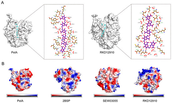 The molecular docking of pectinase with the substrate hexagalacturonic acid and the electrostatic potential maps of four distinct pectinase structures are presented. (A) This section illustrates the molecular docking of pectinases PelA and RKD12910 with hexagalacturonic acid at subsites −3, −2, −1, +1, +2, and +3, respectively. (B) The electrostatic diagrams for pectinases PelA, 2BSP, SEW03055, and RKD12910 are depicted, highlighting the regions of positive (blue), negative (red), and neutral (green/white) charges.