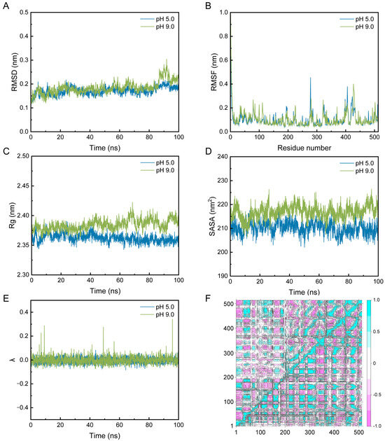 The constant-pH molecular dynamics analysis of PelA was performed at pH values of 5.0 and 9.0. The root-mean-square deviation (RMSD) plots indicate that the systems reached equilibrium after approximately 20 ns, with RMSD values stabilizing between 0.2 and 0.4 nm (Figure 6A). Notably, an increase in RMSD was observed at pH 9.0 compared to pH 5.0, suggesting greater conformational flexibility at higher pH levels, likely due to altered protonation states of the titratable residues in alkaline pectinase PelA. Additionally, root-mean-square fluctuation (RMSF) analysis showed that residue flexibility varied across the protein sequences, particularly at positions 270–300 and 390–440, which correspond to the activity cleft and the region associated with conformational stability. Peaks indicated higher mobility at pH 9 (Figure 6B). These findings suggest that alkaline conditions may enhance local structural dynamics. The radius of gyration (Rg) and solvent-accessible surface area (SASA) plots at pH 5 and 9 clearly demonstrate that the structure of PelA is more pronounced, with increased solvent exposure at pH 9.0, consistent with the observed flexibility throughout the structure (Figure 6C,D). The λ plot illustrates the deprotonated (0) or protonated state (1) under pH 5.0 and pH 9.0 conditions (Figure 6E). The observed range suggests a mixture of protonation states. At pH 5.0, the wavelength (λ) remains relatively stable with minor fluctuations, indicating a consistent protonation environment. In contrast, at pH 9.0, the λ values exhibit more pronounced peaks, suggesting increased transitions between protonation states, likely due to the higher pH favoring the deprotonation of acidic residues. This pH-dependent behavior reflects the protein’s dynamic response to environmental changes, which may influence its structure and function. The dynamic cross-correlation matrices (DCCM) map highlights differences in inter-residue contacts between the two pH conditions, with notable changes in the 200–400 residue region, underscoring pH-induced structural rearrangements (Figure 6F).