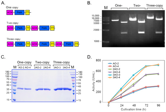 To enhance the gene dosage of pelA in the host genome, a series of recombinant plasmids carrying tandem pelA gene expression cassettes—namely; pAO-pelA; pAO-Du-pelA; and pAO-Tri-pelA—were constructed (Figure 7A,B). Pichia recombinants with varying pelA gene copy numbers in their genomes were obtained and quantitatively analyzed using quantitative PCR (QPCR) (Table 1). As indicated in Table 1, the recombinants AO-2 and AO-4 possess one copy of pelA in their genomes. The strains 2AO-2 and 2AO-4 contain two copies, while the strains 3AO-3 and 3AO-4 harbor three copies of pelA in their genomes, respectively. The expression levels of pelA in these Pichia recombinants were evaluated in this study. As shown in Figure 7C,D, the expression levels gradually increased with the elongation of culture time, peaking at 96 h. The strains with one copy of pelA exhibited an enzyme activity of 280 U/mL of culture. The expression levels of the two-copy and three-copy recombinants were significantly higher than those of the one-copy strains. Notably, the three-copy recombinants generally exhibited the highest enzyme activity at the 96 h time point, reaching an activity level of 720 U/mL of culture in the flask.