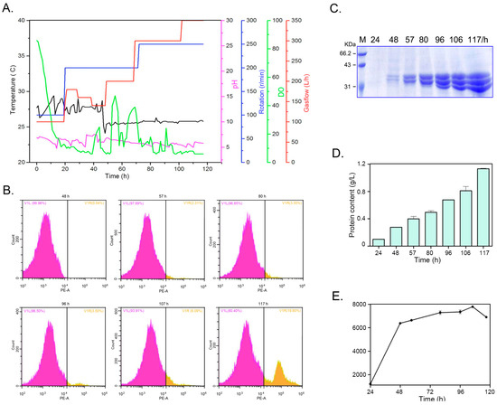 The cultivation of yeast recombinants and the expression of PelA in a 14 L bioreactor were investigated. (A) The parameters varied throughout the entire culture period. (B) Cell counts were obtained using a flow cytometer during the cultivation in the bioreactor. The V1L plot represents the proportion of living cells, while the V1R plot indicates the proportion of dead cells. (C,D) illustrate the protein profiles and content in the supernatant of the culture within the bioreactor. (E) The pectinase activity of the culture in the bioreactor was measured. Samples were aliquoted at intervals of 24 h, 48 h, 57 h, 80 h, 96 h, 106 h, and 117 h.