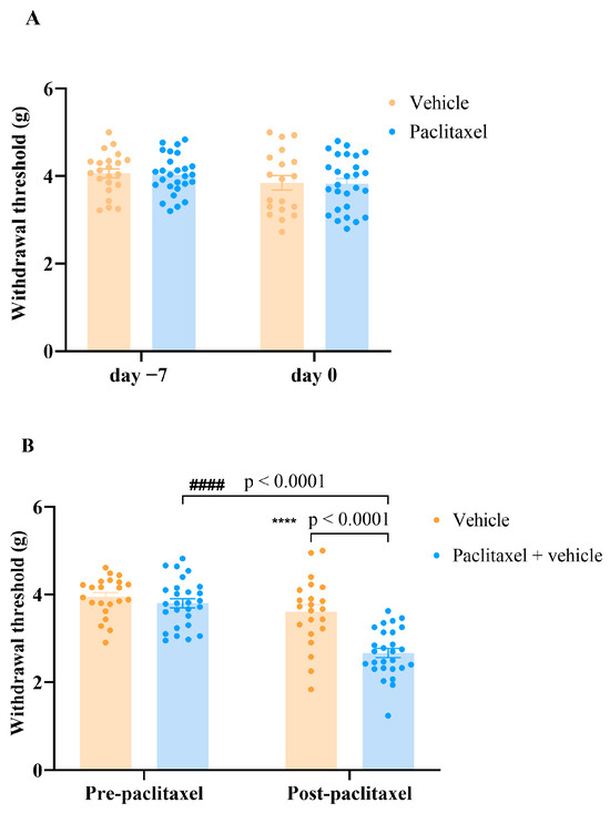 The withdrawal threshold to mechanical stimuli was assessed for both the vehicle- and paclitaxel-treated groups on day −7 and day 0 before paclitaxel treatment (Figure 2A). On day −7, withdrawal thresholds were comparable between the vehicle group (4.06 ± 0.10 g) and the paclitaxel group (4.03 ± 0.09 g; p = 0.8235). This similarity persisted on day 0, prior to the first paclitaxel injection, with thresholds of 3.85 ± 0.17 g for the vehicle group and 3.83 ± 0.19 g for the paclitaxel group (p = 0.9156). Therefore, the data from day −7 and day 0 were combined to establish the pre-paclitaxel baseline (Figure 2B).