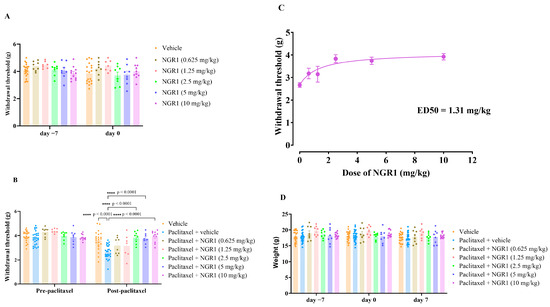 Administration of NGR1 (0.625–10 mg/kg i.p.) twice daily before the start of paclitaxel treatment did not result in any significant change in the withdrawal threshold to mechanical stimuli on day −7 (before the first NGR1 treatment) compared to day 0 (after five consecutive days of NGR1 injections), nor when compared to the vehicle group (Figure 3A). This suggests that NGR1 alone (up to 10 mg/kg administered twice daily) had no effect on the withdrawal threshold of mice as compared to the vehicle group before paclitaxel administration, indicating that NGR1 alone did not have an effect on normal mice response to mechanical stimuli.