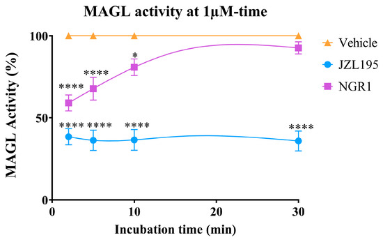 Inhibitory effects of 1 μM NGR1 and JZL195 on human recombinant MAGL activity over time. NGR1, at a concentration of 1 μM, shows a reversible MAGL inhibitory effect over time in comparison to JZL195, an irreversible MAGL inhibitor. Each point represents the mean ± S.E.M of values from 3 to 6 separate experiments. * p = 0.0126, **** p < 0.0001 compared to drug vehicle at the same time after treatment (two-way ANOVA followed by Tukey’s multiple comparison test, Nonlin fit [inhibitor] vs. response [three parameters]).