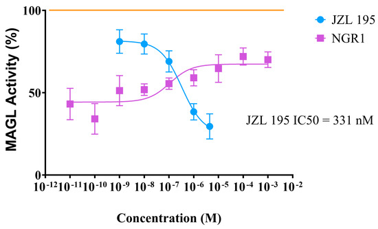 Inhibitory effects of various concentrations of NGR1 and JZL195 on human recombinant MAGL after 2 min of incubation. Each point represents the mean ± S.E.M of values obtained from 3 to 6 separate experiments (Nonlin fit [inhibitor] vs. response [three parameters]).
