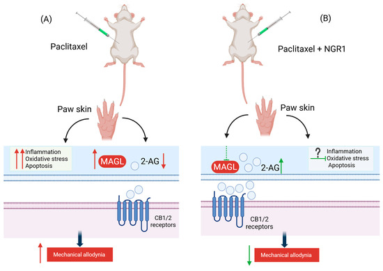 A schematic representation of the antiallodynic effect of NGR1 in a mouse model of paclitaxel-induced mechanical allodynia. NGR1 prevents the development of PIMA. Multiple pathways could potentially be involved in NGR1-induced alleviation in mechanical allodynia in female mice. (A) In a female mouse model of PIMA, the intraperitoneal injection of paclitaxel increases MAGL activity in paw skin of mice. The increase activity of MAGL would enhance the degradation of 2-AG and thus lead to the reduction in the levels of 2-AG. Consequently, low levels of 2-AG could reduce the activation of the CB1 and CB2 receptors resulting in increased sensitivity to mechanical allodynia. Paclitaxel also activates pathways involved in oxidative stress, apoptosis, and inflammation (B) Prophylaxis treatment with NGR1 before the development of PIMA could potentially reduce the paclitaxel-associated increases in MAGL activity and thus decrease the degradation and increase the availability of 2-AG to bind to CB1 and CB2 receptors. Stimulation of these receptors could reduce the mechanical allodynia induced by paclitaxel and subsequently elicit the antiallodynic and analgesic effect of NGR1. Other pathways such as anti-inflammatory, anti-apoptotic, and antioxidant could also possibly be activated and involved in NGR1 antiallodynic and analgesic actions. The exact contribution needs further experimental confirmation. 2-AG: 2-arachidonoyl glycerol; MAGL: monoacylglycerol lipase; NGR1: Notoginsenoside R1; PIMA: paclitaxel-induced mechanical allodynia, (Created by biorender.com).