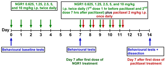 NGR1 was administered i.p. at a dosage range from 0.625 to 10 mg/kg twice daily for five consecutive days, beginning seven days prior to the initiation of paclitaxel administration. This was followed by an additional administration of NGR1 at the same dose ranges (0.625–10 mg/kg) for another five days one hour before the injection of paclitaxel. The next injection of NGR1 was 7 h after the paclitaxel injection. Control animals received the vehicle for paclitaxel, comprising ethanol and Cremophor EL, following the same injection pattern as paclitaxel. The control and paclitaxel animals were also administered the vehicle for NGR1, distilled water, following the same administration pattern as NGR1 (Figure 9). All behavioral studies were not blinded. The initial distribution and randomization of animals into different groups was based on their baseline behavioral values at day −7.