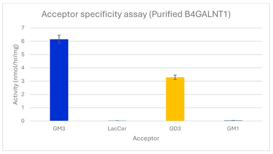 The human enzyme can be proteolytically released as a soluble form [22]. Previous studies with various forms of B4GALNT1 from human, mouse, and rat sources also showed that GM3 is the major acceptor substrate and GM2 is, therefore, the major GSL product of B4GALNT1 [4,22,31,32,33,34,35,36]. The rat enzyme from ascites hepatoma cells, for example, has 77.3% activity towards GD3 compared to GM3 and only 1.2% activity with LacCer [34]. A high B4GALNT1 activity was achieved by Welland et al. [37] using a liposome-based assay with the enzyme tethered to the membrane via a His-tag.