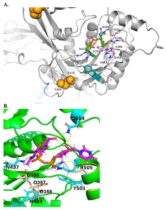 Figure 4 shows a model of B4GALNT1 docked with the essential donor substrate UDP-GalNAc and suggests that conserved N437, R505, R288, and K486 are engaged in hydrogen bonding interactions with donor UDP-GalNAc and could be associated with the UDP reaction product. In addition, H483 and Y501 are near the UDP-GalNAc binding site and may be crucial residues for other interactions. The proximity of the F392 side chain to the uridine moiety suggests the possibility of coordination via pi–pi stacking. The DxD motif (356-358) that can coordinate Mn2+ ion is in proximity to Y501, which may be necessary for coordinating the hydrophobic acceptor substrate. R505 is coordinated near C1 of the GalNAc moiety and is mutated in GM2 synthase deficiency [25] (Figure 4). It seems likely that R505 and H483 are also involved in binding sialylated acceptors such as GM3. As with other GTs, it was not possible to successfully dock the acceptor substrates into the protein, likely because of the complexity in binding a ceramide moiety, as well as a complex glycan chain.