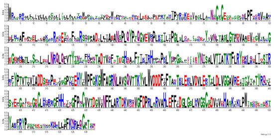 Table 1 lists the conserved amino acids that may represent important residues for the biological function of B4GALNT1. The consensus sequence aligned by MUSCLE using 352 aligned protein sequences and generated with WebLogo is shown in Figure 5. Two centrally located DxD sequences are found in GM2 synthases. However, only D356, D357, and D358 are highly conserved sequences in GM2 synthases that line the active site, and D356 may be the critical Asp residue involved in catalysis [23]. DxD is a widely conserved motif in GT-A folded enzymes and is thought to coordinate with metal ions and play a role as a catalyst (Table 1) [38]. Modeling showed that the DxD motif (D356 to D358) is within the catalytic site, explaining that mutations of D356 and D358 abolished activity. The DD sequence is also highly conserved in B4GALNT1. Inamori et al. [39] identified an inactive SPG variant of D313, the second Asp of the DD sequence, that is thought to bind UDP-GalNAc. Other inactive SPG variants of highly conserved residues include N437K, A441E, P453H, and R519W. However, the F438L mutant exhibited low (<10%) activity.
