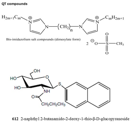 Currently, inhibitors for B4GALNT1 are not available. We tested several synthetic compounds as inhibitors of B4GALNT1 activity, but many of them did not inhibit the activity. These compounds are not directly related to structures of B4GALNT1 substrates but could potentially bind to the protein via hydrophobic or electrostatic interactions. A series of compounds named QT [43] showed various degrees of inhibition. QT compounds have two positively charged bis-imidazolium rings connected to an aliphatic spacer between rings (n) and symmetrical aliphatic wing chains (m) attached to the nitrogen of imidazolium groups. The highly flexible aliphatic chains have varying numbers of carbons, and the compounds are in dimesylate salt forms (Table 2, Figure 6). QT compounds with a higher number of carbons in the aliphatic chains previously showed inhibition for selected enzymes, and this was unrelated to the type of substrates used [43]. Another potential inhibitor was 2-naphthyl 2-butanamido-2-deoxy-1-thio-β-D-glucopyranoside (612). GlcNAc-naphthyl derivatives such as 612 were shown to inhibit bovine milk β1,4-Gal-transferase as acceptor substrate analogs [44,45].