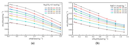 Li2CO3 solubility in a mixed solution. (a): a mixed solution of Na2CO3 = 0.5 mol·kg−1; (b) a mixed solution of NaCl = 1.0 mol·kg−1.