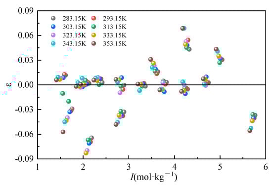 The Li2CO3 molalities in the mixed solution were calculated according to the model parameters, respectively, and the deviation ε relative to the total ionic strength in the mixed solution is plotted in Figure 4. As can be seen in Figure 4, the relative deviations of all the experimental values of the solubility of Li2CO3 from the model-calculated values are within ±0.1, which suggests that the solubility model equations can better represent the solubility properties of Li2CO3 in the Na2CO3-NaCl mixed solution.
