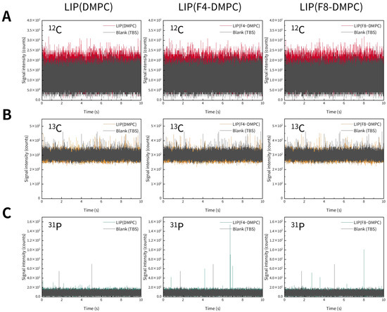 Representative time-resolved profiles for three types of liposomes [LIP(DMPC), LIP(F4-DMPC), and LIP(F8-DMPC)] suspended in TBS, obtained via spICP-MS while monitoring 12C (A), 13C (B), and 31P (C) individually.