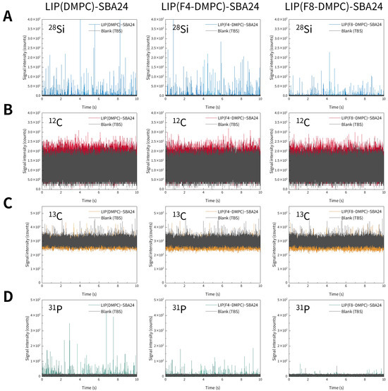 Representative time-resolved profiles for mesoporous SiO2 microspheres (SBA24) with the bound liposomes [LIP(DMPC), LIP(F4-DMPC), and LIP(F8-DMPC)] suspended in TBS, obtained via spICP-MS while monitoring 28Si (A), 12C (B), 13C (C), and 31P (D) individually.