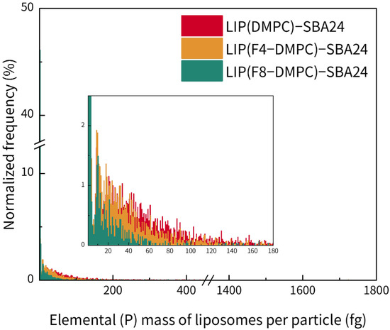 Elemental (P) masses of liposomes [LIP(DMPC), LIP(F4-DMPC), and LIP(F8-DMPC)] bound to each mesoporous SiO2 microsphere (SBA24). The measurements were performed using spICP-MS with 31P monitoring based on a conventional calibration approach using a phosphate ion standard solution. Inset: Enlarged view.
