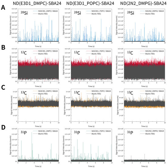 Representative time-resolved profiles for mesoporous SiO2 microspheres (SBA24) with the bound nanodiscs [ND(E3D1_DMPC), ND(E3D1_POPC), and ND(2N2_DMPG)] suspended in TBS, obtained via spICP-MS while monitoring 28Si (A), 12C (B), 13C (C), and 31P (D) individually.