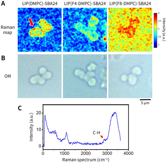Raman spectrum map (A), OM images (B), and Raman spectrum (C) of mesoporous SiO2 microspheres (SBA24) with the bound liposomes [LIP(DMPC), LIP(F4-DMPC), and LIP(F8-DMPC)]. The red arrow in (A) indicates the area of strong C–H peaks surrounding the SBA24 particles, and the red arrow in (C) indicates a peak resulting from C–H bonds in liposome-derived lipids.