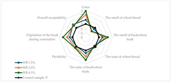 The tested wholemeal and wheat bread samples enriched with buckwheat husk were sensory evaluated using the differential profiling method by a trained team of ten panelist’s with an average age ranging from 22 to 40, with proven sensory sensitivity according to EN ISO 8586:2012 [55] from the Faculty of Food Sciences of the University of Warmia and Mazury in Olsztyn [56]. All bread samples, including the control, were blind-coded to minimize bias, and the order of presentation was randomized. Sensory analysis was carried out under controlled conditions in a sensory analysis laboratory. The panelist’s task was to mark on a bipolar scale how much a specific feature of the tested sample differs from the standards, which were not enriched with buckwheat husk test materials. A deviation scale from −3 (the lowest intensity of the tested sensory characteristic) to +3 (the highest intensity of the tested sensory characteristic), where 0 corresponded to the quality of the standard sample, was used. The scores for color, taste, odor, flexibility and overall acceptability were given by each member of the team. All procedures related to sensory evaluation were conducted in compliance with applicable laws and the ethical guidelines established by the Research Ethics Committee of the University of Warmia and Mazury in Olsztyn. Participation was entirely voluntary, with all individuals fully informed about the study’s purpose and scope. Participants provided informed consent, acknowledging that their responses would remain confidential. They also retained the right to withdraw from the study at any point without needing to provide a reason.