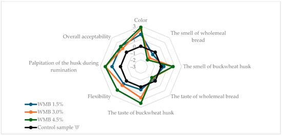 Figure 1 and Figure 2 show the results of the sensory evaluation of wheat and wholemeal breads enriched with buckwheat husk in comparison to control samples without husk addition. The buckwheat husk addition affected all tested sensory parameters in both wheat and wholemeal breads samples. In both types of bread, the addition of the husk reduced the intensity of the typical bread aroma even up to −1.6 in WMB 4.5%, but the characteristic bread flavor was retained. Apart from the WMB 1.5% bread, the smell and taste of the added husk were clearly noticeable. Compared to wheat bread, in wholemeal bread the addition of the husk clearly increased the flexibility of the bread, reaching the highest value (2.0) in the sample with the highest husk addition (WMB 4.5%). In wheat bread, the palpitation of the husk during chewing increased steadily at three levels of enrichment with husk (0.6, 1.2, 2.14 in WB 1.5%, WB 3.0% and WB 4.5%, respectively), while in wholemeal bread this attribute was scored for 1.25 in WMB 1.5% and 2.25 for both WMB 3.0% and WMB 4.5%. Similarly, with the color of wholemeal bread, the addition of the husk at 4.5% did not result in a visible increase in the color intensity of the bread compared to the 3.0% WMB (2.8) although the instrumental analysis showed a clear increase in the total color difference (ΔE*) between these two samples. This may be attributed to the already dark crumb color of wholemeal bread, which reduces the contrast perceived by observers; therefore, while instrumental methods can detect fine changes in color parameters, these differences may not always translate into noticeable sensory changes, especially when a visual saturation threshold is reached. Therefore, both methods provide complementary insights, and instrumental analysis confirms physical changes in crumb color, while sensory analysis reflects practical consumer perception. Conversely, in wheat bread, as the addition of the husk increased, the color of the bread became more intense (0.93, 2.07, 2.93 in WB 1.5%, WB 3.0%, and WB 4.5%, respectively). The results showed that wholemeal bread, due to its texture and darker color as a result of the addition of wholemeal flour, better masked the addition of husk at the highest enrichment level used in the experiment. Overall, acceptability of all tested bread samples with husk addition was rated higher than of control breads, reaching the highest value of 1.2 for WMB 1.5% and WMB 4.5%, which allowed the conclusion that the modified sensory characteristics of the bread through the addition of the husk would be attractive to consumers. The unexpectedly high acceptability of bread enriched with 4.5% husk may be attributed to the fine particle size of the powdered buckwheat husk, which contributed to the diversification of the structure and color of the crumb and gave it interesting flavor characteristics. Similar results were observed by Sakhare et al. (2013), who reported that bread made with finer fiber particles achieved better sensory qualities compared to those with coarser particles [49].