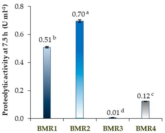 The achieved proteolytic activities at 7.5 h fermentation time are presented in Figure 1. The purge bath isolates BMR1, BMR2, and BMR4, which exhibited the maximum proteolytic activity for 7.5 h of incubation time. However, isolate BMR3 only showed a maximum proteolytic activity of 0.11 ± 0.00 U mL−1 at 15 h fermentation time, an activity similar to that presented by isolate BMR4 at half the time (Tukey HSD test, p < 0.05, n = 3).