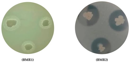 The colonies in SMA medium plates of the BMR1 and BMR2 isolates exhibited irregular mucous colony borders and large proteolytic translucent halos, as shown in Figure 3.