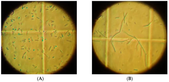 Thoma chamber microscope visualisation showing (A) the rod-shaped cells with the spores and (B) the cell chains for the BMR2 isolate (Phase-contrast optical microscope with 400× magnification).