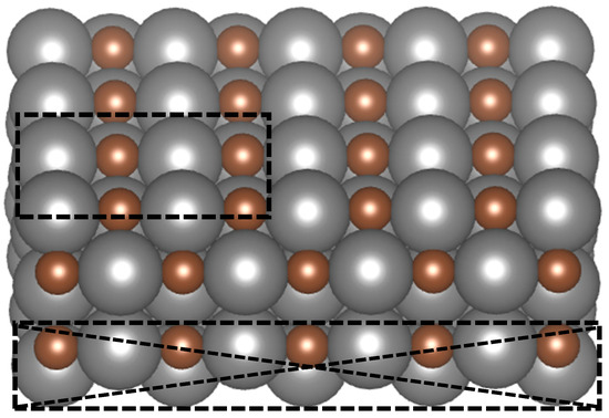A 4 × 4 × 1 Monkhorst–Pack k-point was used for Brillouin zone sampling, with the cutoff energy of 400 eV. The surface slab consisted of five atomic layers and a total of 40 atoms, equally divided between metal and carbon atoms. Each layer contained four metal and four carbon atoms. A vacuum gap of 20 Å was introduced along the z-direction to avoid periodic interactions, while the x and y boundaries were kept periodic. As indicated in Figure 1, the upper three layers, along with adsorbates, were permitted to undergo complete relaxation during structural optimization, whereas the bottom two layers were constrained.