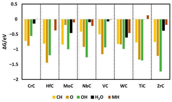 Calculated Gibbs free energies of all species on the surface of carbides. In the case of HfC and TiC, water does not bind.