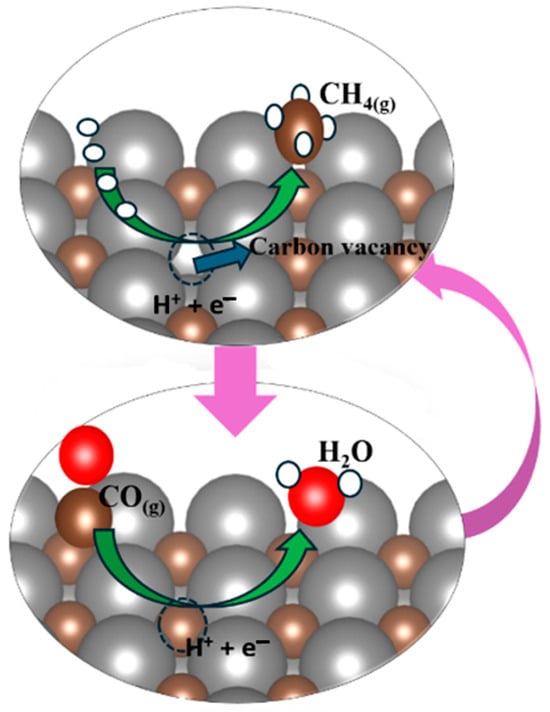 During the experimental synthesis of TMC, there is a possibility that a defect in the form of carbon can be formed, or there is a possibility that, during the electrochemical process, due to the continuous protonation, four protons attach to the C of carbides and release methane by leaving the carbon vacancy. Thus, the release of methane generates the carbon vacancy on the carbide’s surface. This carbon vacancy of carbides’ surface can be occupied by carbon from ambient CO, and one oxygen atom of CO is converted into a water molecule after finishing the electrochemical step with a clean and non-defective surface. This ongoing electrochemical cyclic process generates a product like methane, as illustrated in Figure 3.