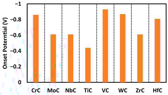 The ΔH0K→T term denotes changes in the internal energy of the system due to the effect of temperature, which can be calculated by this formula , where is the quantity of heat at constant pressure, and the integral of this equation suggests that at ambient temperature, the heat contribution is minimal. The values of the gas phase of the molecules were taken from the tables in the textbooks [45]. In our previous study, we already calculated the electronic properties of carbides [32]. The theoretical onset potential (OP) required to drive the reaction was calculated using the computational hydrogen electrode model by using Equation (4). The step with the highest free energy change (ΔGmax) determines the limiting potential.