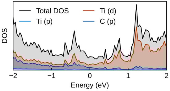Furthermore, we investigated the electronic properties of the materials by calculating the density of states (DOS) and performing charge analysis. Figure 8 illustrates the DOS for TiC, identified as the most promising catalyst. The results reveal an overlap between the carbon p orbitals and metal d orbitals, with states extending across the Fermi level—indicating the metallic nature of these transition metal carbides.