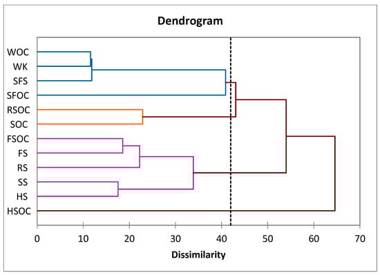 Dendrogram for cluster analyses of oilseeds and oilcakes. SFS, SFOC—sunflower seeds and oilcake, HS, HSOC—hemp seeds and oilcake, RS, RSOC—rape seeds and oilcake, FS, FSOC—flax seeds and oilcake, SS, SOC—sesame seeds an oilcake, WK, WOC—walnut kernels and oilcake.