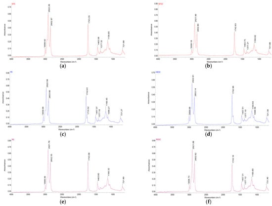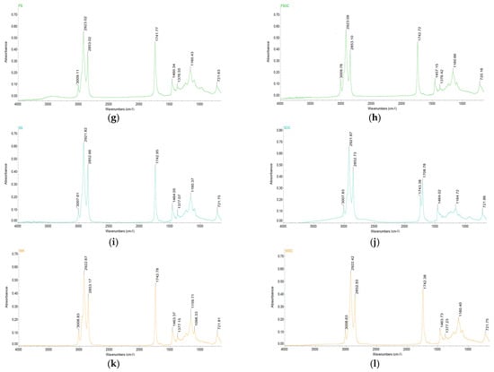 All samples presented a band at 720.16–721.89 cm−1, produced by a rocking vibration of long chain methylene, characteristic of fatty acids with long carbon skeletons [48,49].