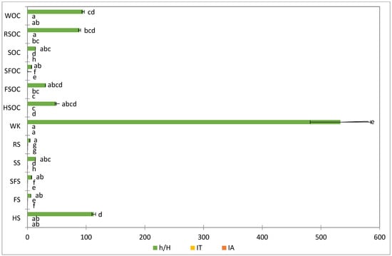 The most advantageous parameters for oilcakes can be found in WK and RSOC. In contrast, SFOC was characterized by the highest index values (0.13 and 0.29, respectively) and lowest h/H ratio (7.09) (Figure 3).