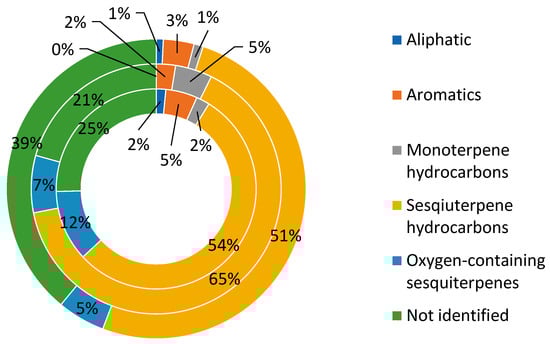 The C. sphagnicola samples tested were dominated by compounds belonging to sesquiterpenes (49.91–64.21%), which are hydrocarbons, and sesquiterpenoids (4.99–11.56%), which are oxygenated derivatives of sesquiterpenes. In addition to the above-mentioned groups of compounds, the tested samples contained compounds belonging to monoterpenes (0.95–4.73%), aromatic compounds (2.43–5.12%), and aliphatic compounds (0.74–1.55%). In the case of the C. sphagnicola f. paludosa samples, no aliphatic compounds were detected (Figure 1). No significant differences in the VOC composition were observed between the samples collected in 2021 and 2022. The detailed percentage share of a given group of compounds in C. sphagnicola, divided into genetic groups and the year of collection of the research material, is presented in Figure S2a–c.