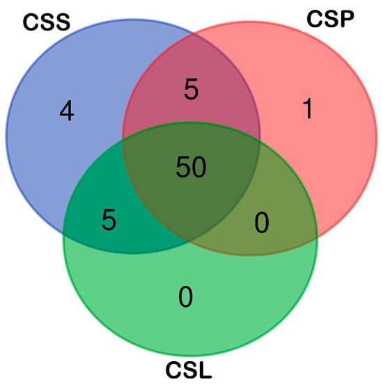 Venn diagram showing the distribution of volatile compounds in the studied groups of C. sphagnicola: C. sphagnicola f. sphagnicola (CSS), C. sphagnicola f. paludosa (CSP), and C. sphagnicola LC (CSL).