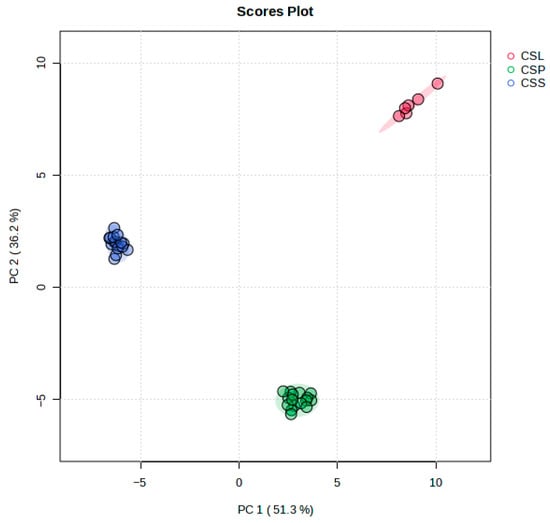 Two-dimensional PCA scatter plot based on all the detected VOCs in the C. sphagnicola samples: C. sphagnicola f. sphagnicola (CSS), C. sphagnicola f. paludosa (CSP), and C. sphagnicola LC (CSL). The percentage of explained variance (R2X) was 51.3% for PC1 and 36.2% for PC2, and the predictive ability (Q2) was 43.0% and 64.0%, respectively. Different colors indicate the genetic group affiliation. Shaded areas indicate the 95% confidence regions.