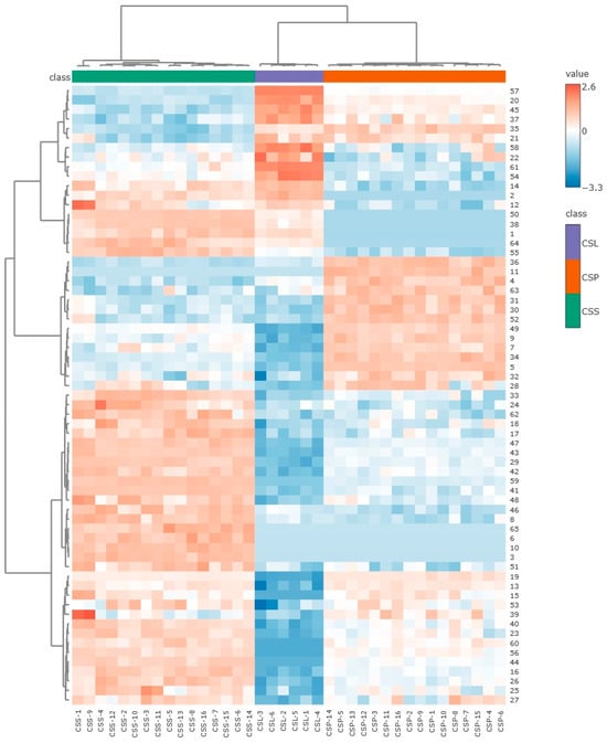 Heatmap clustering of VOC profiles from C. sphagnicola samples: C. sphagnicola f. sphagnicola (CSS), C. sphagnicola f. paludosa (CSP), and C. sphagnicola LC (CSL). The annotation bar shows the clustering of the samples by group (class). Each cell was colored based on the level of the concentration of the chemical compound in the sample.