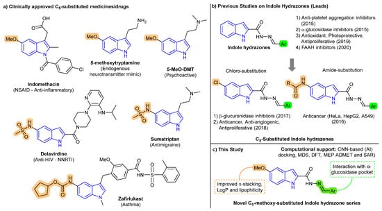 - Baharudin, M.S.; Taha, M.; Imran, S.; Ismail, N.H.; Rahim, F.; Javid, M.T.; Khan, K.M.; Ali, M. Synthesis of Indole Analogs as Potent β-Glucuronidase Inhibitors. Bioorg. Chem. 2017, 72, 323–332. [Google Scholar] [CrossRef]