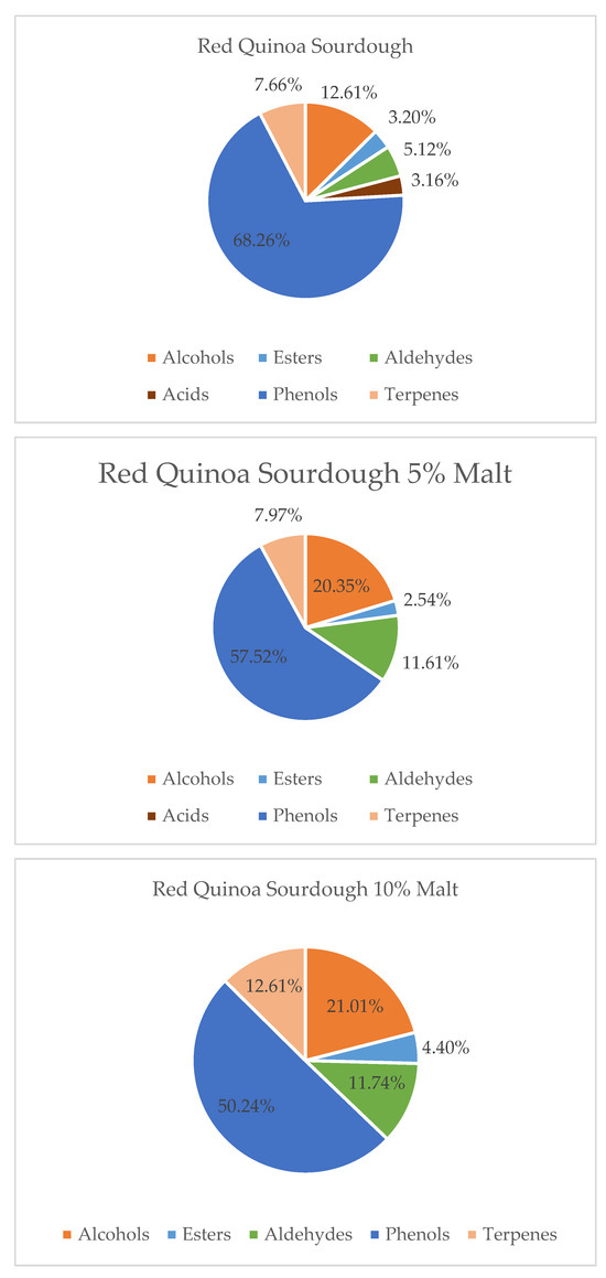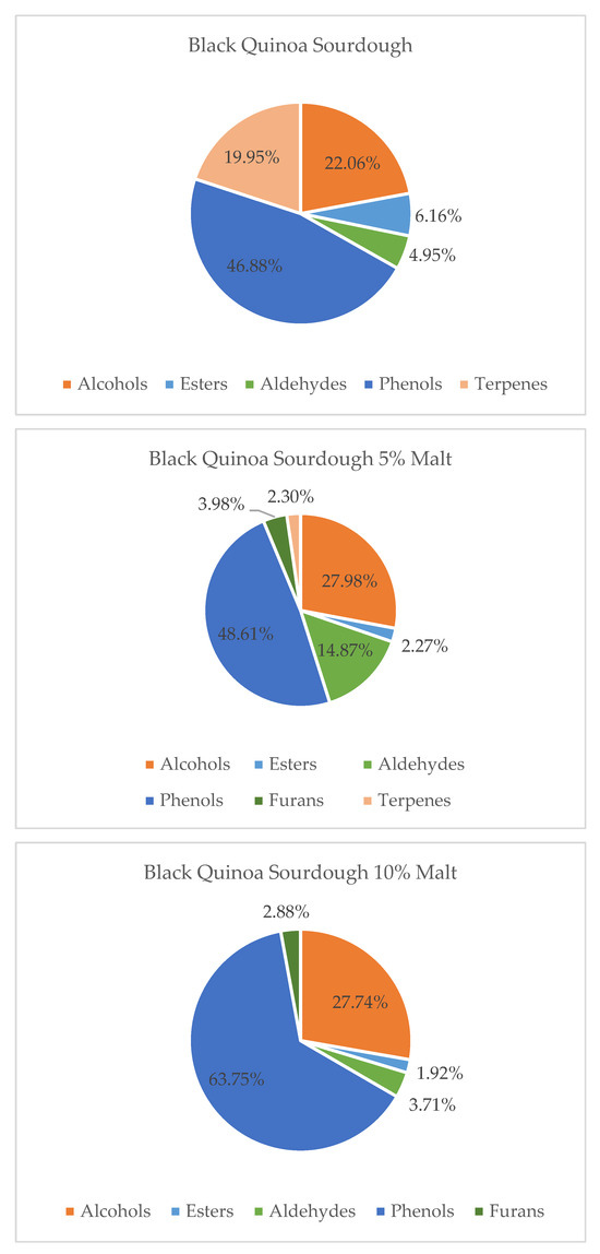Importantly, GC-MS analysis of volatile compounds confirmed that quinoa malt addition modulates the aromatic profile of sourdoughs by enriching the presence of esters, aldehydes, terpenes, and alcohols. These compounds are associated with fruity, floral, and herbal aromas, contributing to a more complex and appealing flavor profile. White and red quinoa sourdoughs enriched with malt showed the most favorable balance of volatiles, while black quinoa sourdough required careful adjustment of malt levels to avoid overpowering, earthy notes.