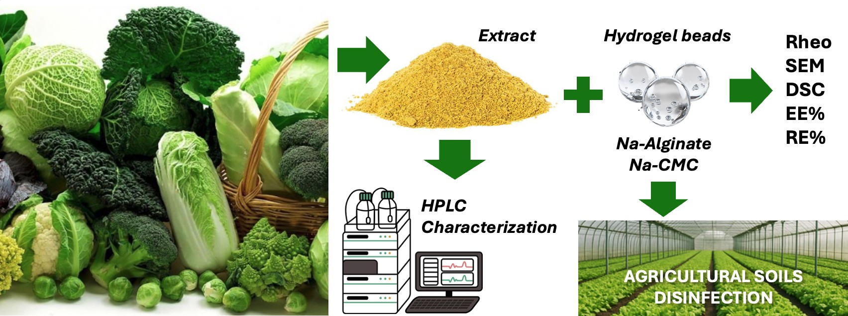 Borrowing the basic ideas and concepts behind biofumigation and aiming at a zero-waste circular economy concept, byproducts from agrifood supply chains can represent a source of extremely interesting bioactive compounds. Several (nano)carrier systems have been proposed for CR, where either the vector matrix or the bioactive compounds (or both) were derived from byproducts of agrifood production [39,40,41,42,43,44]. Food waste from Brassicaceae crops is a rich source of glucosinolates, which can be exploited for eco-friendly antimicrobial soil treatment as a viable alternative to synthetic fumigants. By encapsulating bioactive plant-derived compounds into hydrogel matrices, it is possible to develop innovative soil treatment methods that combine the benefits of biofumigation with CR principles. Hydrogel beads loaded with ITC-based microemulsions have recently been proposed as an enhanced and innovative alternative to biofumigation [45].