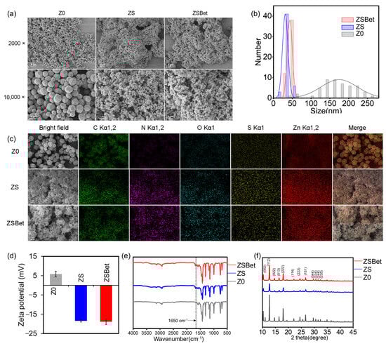 Characterization of the synthesized Z0 (pristine ZIF-8), ZS (SPBP-functionalized ZIF-8), and ZSBet (SPBP-functionalized ZIF-8 loaded with betaine). (a) Scanning electron microscopy (SEM) observation of the synthesized ZIF-8. (b) Size distribution of the synthesized ZIF-8 revealed by dynamic light scattering (DLS) analysis. (c) Energy-dispersive spectroscopy (EDS) elemental mapping images of the synthesized ZIF-8. Green, purple, blue, yellow, and red represent carbon, nitrogen, oxygen, sulfur, and zinc, respectively. (d) Zeta potentials of the synthesized ZIF-8. (e) Fourier-transform infrared (FTIR) spectra of the synthesized ZIF-8. The gray curve represents Z0, the blue curve represents ZS, and the red curve represents ZSBet. (f) X-ray diffraction (XRD) of the synthesized ZIF-8. The gray curve represents Z0, the blue curve represents ZS, and the red curve represents ZSBet.