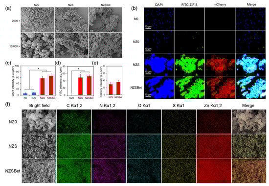 The interaction between synthetic ZIF-8 variants (i.e., Z0, ZS, ZSBet) and the probiotic bacterium Novosphingobium capsulatum (Novo). (a) SEM observation of the interaction of synthetic ZIF-8 variants with Novo. (b) Confocal laser scanning microscopy images of the interaction of synthetic ZIF-8 with Novo. DAPI (blue) stains the nuclei of Novo cells; FITC-ZIF-8 (green) indicates FITC-labeled ZIF-8 nanoparticles; and mCherry (red) corresponds to the synthesized protein SPBP. (c) Quantification of the DAPI fluorescence. (d) Quantification of the FITC fluorescence. (e) Quantification of the mCherry fluorescence. (f) Energy-dispersive spectroscopy (EDS) elemental mapping images of the interaction of synthetic ZIF-8 with polysaccharide-producing bacteria. Green, purple, blue, yellow, and red represent carbon, nitrogen, oxygen, sulfur, and zinc, respectively. The asterisks (*) indicate significant differences between the groups (p < 0.05).