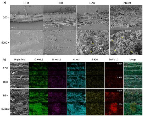SEM imaging at both low (200×) and high (5000×) magnifications revealed distinct differences in material colonization across groups (Figure 3a). Among them, the root surface structures of the RCK and RZ0 groups were relatively smooth, and almost no obvious bacterial aggregation or material deposition was observed, indicating that the bare MOF material Z0 itself had difficulty achieving effective colonization. In contrast, the root surfaces of the RZS and RZSBet groups showed extensive material adsorption and bacterial adhesion phenomena, forming a dense network structure-like biofilm, demonstrating typical microbial–material co-assembly characteristics. Consistently, colony-forming unit (CFU) assays revealed that the roots treated by RZS and RZSBet captured much more bacteria than the roots treated by RCK and RZ0 (1.54 × 107~2.08 × 107 CFU/g roots versus 0.17 × 107~0.30 × 107 CFU/g roots, Figure S6). Elemental mapping via EDS further corroborated these findings (Figure 3b). Compared with RCK and RZ0, the signal intensities of microbial-related elements (such as C, N, O, and S) in RZS and RZSBet were significantly enhanced. Meanwhile, RZS and RZSBet exhibited distinct Zn signals derived from the MOF materials. Intensity quantification further showed that higher levels of Zn signals appeared on the roots of the RZS and RZSBet groups than that on the roots of the RCK and RZ0 groups (26,695~36,694 versus 2554~5002, Figure S7). These results indicated that the ZIF-8 materials and probiotics achieved more efficient co-enrichment and colonization under the effect of SPBP. In conclusion, the introduction of SPBP significantly enhanced the attachment and enrichment ability of MOF materials on the root surface, promoted the co-colonization and co-assembly of probiotics and materials, and thus realized the potential for targeted rhizosphere localization.