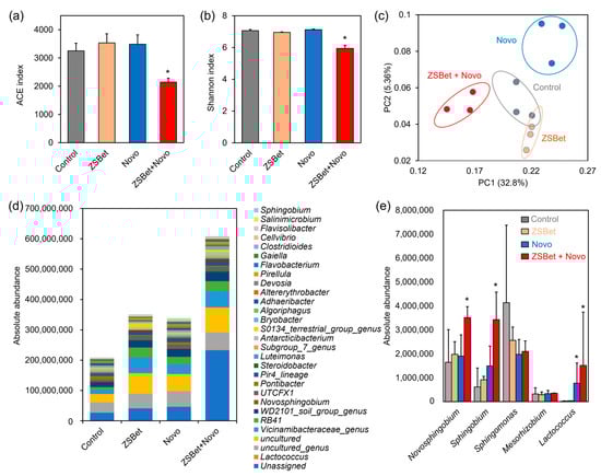 To evaluate the potential of ZSBet and Novo in ameliorating saline–alkali soils, we established four treatments: Control, ZSBet, Novo, and the combined ZSBet + Novo treatment during wheat cultivation. After 110 days, rhizosphere soil samples were collected from the wheat rhizosphere regions and subjected to total DNA extraction for high throughput 16S rDNA sequencing. The results revealed that the application of the ZSBet + Novo co-assembly significantly influenced the structure and diversity of rhizosphere microbial communities, while ZSBet or Novo alone had no significant impact on the diversity compared with the control (Figure 4a,b). Specifically, the α-diversity indices, including ACE and Shannon, were significantly reduced under the ZSBet + Novo treatment, indicating a marked decline in both species’ richness and community evenness (Figure 4a,b). This reduction in diversity is likely attributable to the enhanced colonization of functional bacteria (e.g., Novo). Such colonization may further promote competitive exclusion and microenvironmental restructuring, thereby suppressing hazardous microbial populations.