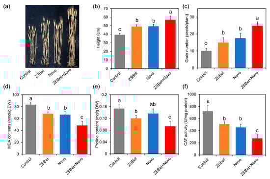 Effects of different treatments (Control, ZS, ZSBet, and ZSBet + Novo) on wheat growth and root physiological characteristics under saline–alkali stress. (a) Morphological comparison of wheat plants after 110 days of cultivation. (b) Plant height. (c) Grain number per spike. (d) Root malondialdehyde (MDA) content. (e) Root proline (Pro) content. (f) Root catalase (CAT) activity. Data are expressed as mean ± standard deviation (SD, n = 5). Different lowercase letters indicate statistically significant differences among treatments at p < 0.05 (one-way ANOVA followed by Tukey’s test).
