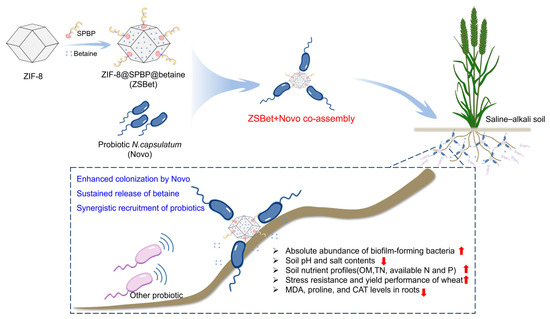 Soil salinity and alkalinity continue to threaten global agriculture, urgently requiring efficient and environmentally sustainable remediation strategies [61,62]. In this study, to address the rapid degradation of stress-responsive small molecules and the limited colonization ability of rhizosphere probiotics, we developed an intelligent nanocarrier named ZSBet. This sustained-release platform was co-assembled from a synthetic polysaccharide-binding protein (SPBP), betaine, and metal–organic framework (ZIF-8), enabling the targeted delivery of the protective osmolyte betaine. ZSBet can be assembled in conjunction with rhizosphere probiotics and precisely targeted at plant roots. This co-assembled system further enhances the adaptability of plants to saline–alkali stress by strengthening rhizosphere colonization, sustainably releasing stress-resistant molecules, and regulating microbial communities, thereby providing an efficient and sustainable solution for saline–alkali soil remediation.