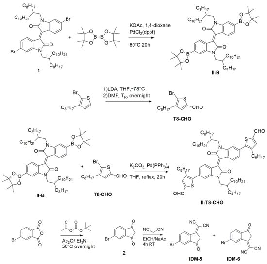3.2.7. Synthesis of 2,2′-((2Z,2′Z)-((((E)-1,1′-Bis(2-Octyldodecyl)-2,2′-Dioxo-[3,3′-Biindolinylidene]-6,6′-Diyl)Bis(4-Octylthiophene-5,2-Diyl))Bis(Methaneylylidene))Bis(-Bromo-3-Oxo-2,3-Dihydro-1H-Indene-2,1-Diylidene))Dimalononitrile (II-T8-IDM5)
