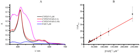 Absorption spectra of the complex of CYP2C9 + FAD revealed a Soret peak characteristic of heme proteins (400–416 nm) and a typical shoulder at 450–475 nm, indicating the presence of flavins, as depicted in Figure 1A, with a concentration dependence on the flavin content (Figure 1B). The complex of CYP2C9 + FAD demonstrates a hyperchromic effect with a bathochromic shift (from 416 nm to 419 nm), confirming the interaction of these components. These results are comparable to those obtained in [28].